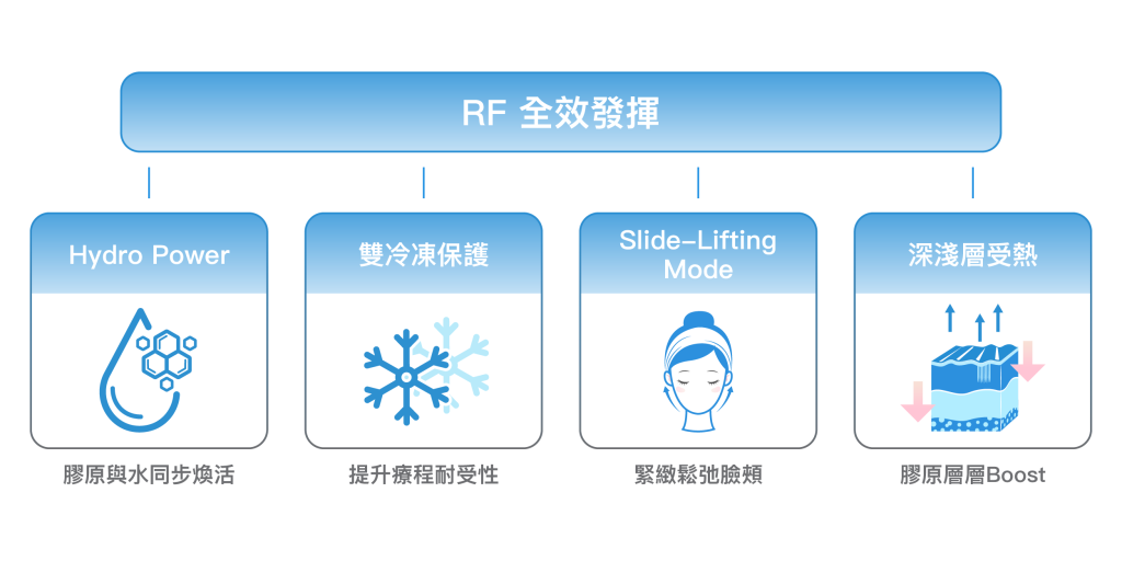 全新「Chill Firm冰感膠原療程」,將單極射頻深至肌底4.3mm並加熱至55—75度的膠原引爆熱點,