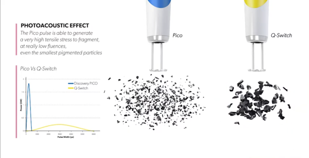 有別於傳統激光透過光熱效應(Photo-thermal Effect)來打散色素,皮秒以其短脈衝(1皮秒=1萬億分之1秒)、高功率,發射高能量光束,令治療位置黑色素瞬間受熱,黑色素旋即劇烈膨脹而分裂,亦即是「光機械效應」(Photo-mechanical Effect),令黑色素粉碎。色素碎如粉塵,輕易被巨噬細胞吞噬,並經由淋巴系統排出體外,達致高效而安全去斑效果。