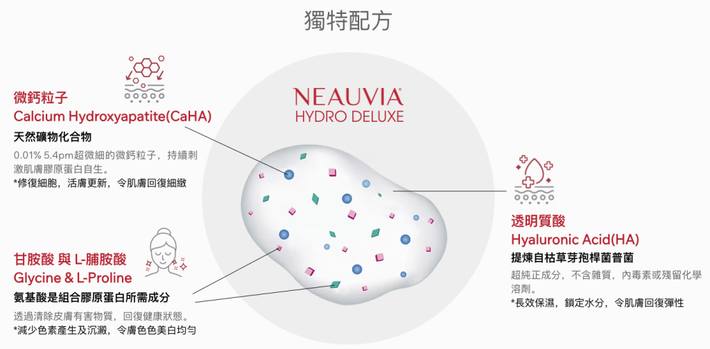 - 其4大主要成份有透明質酸(Hyaluronic Acid)與微鈣粒子(Calcium Hydroxyapatite)、甘氨酸和L-脯氨酸。
