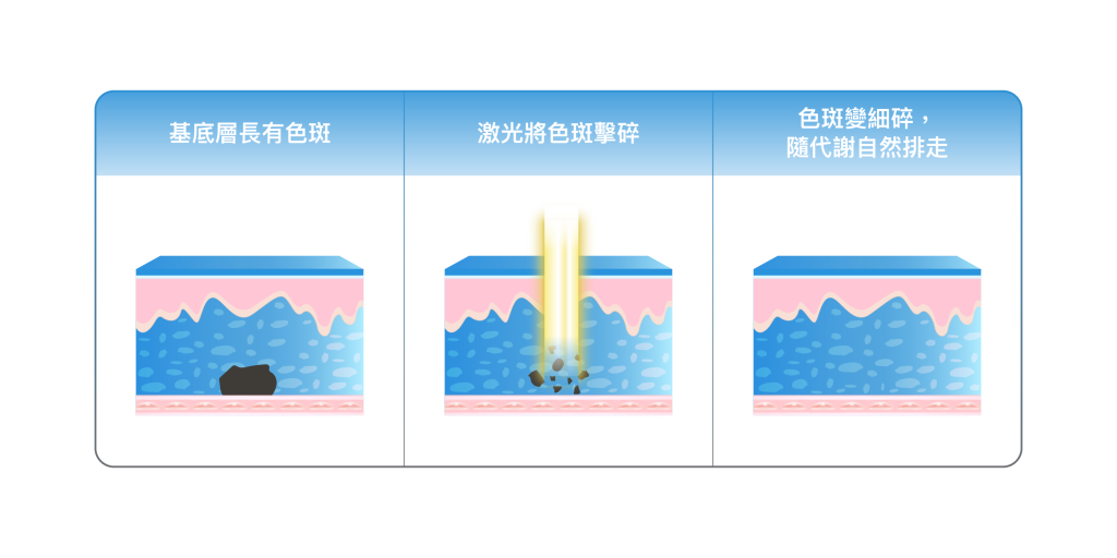 每次療程相隔6至8星期,待治療位置的色素慢慢變淡,再就剩餘色素,進行下一次激光去斑治療。一般而言,進行3至4次療程後,已經可以取得顯著效果。但由於每個人的色素類型、位處深度及大小不一,治療次數亦會因人而異。