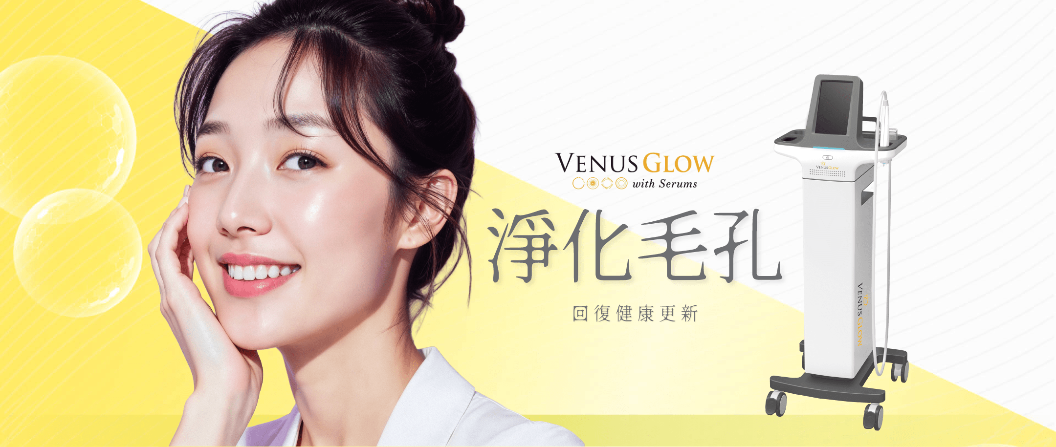 Venus Glow™ 毛孔槍屬非入侵性毛孔淨化療程,利用一次性真空吸頭、360度噴射、雙軌超微注入,發揮「開啟、深層淨化及修護毛孔」三重護理,取得FDA及CE認證,徹底清潔毛孔,暢通呼吸,令肌膚重拾正常代謝,回復28日健康更新周期,細緻淨白肌膚重現人前。
