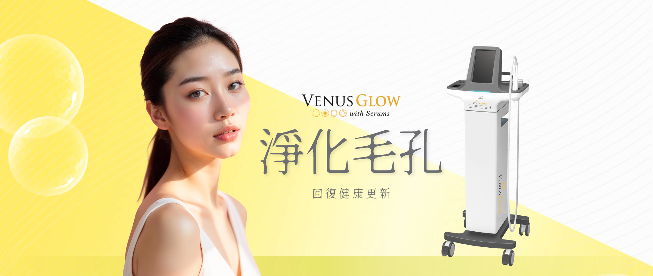 Venus Glow™ 毛孔槍屬非入侵性毛孔淨化療程,利用一次性真空吸頭、360度噴射、雙軌超微注入,發揮「開啟、深層淨化及修護毛孔」三重護理,取得FDA及CE認證,徹底清潔毛孔,暢通呼吸,令肌膚重拾正常代謝,回復28日健康更新周期,細緻淨白肌膚重現人前。